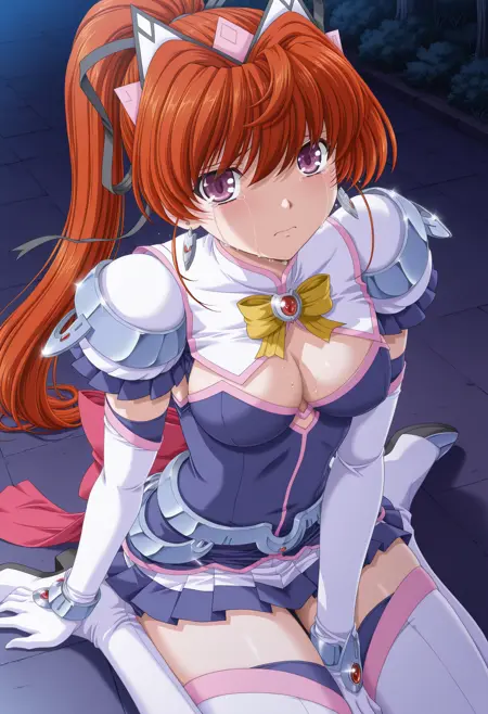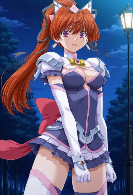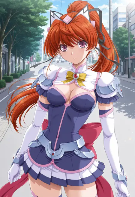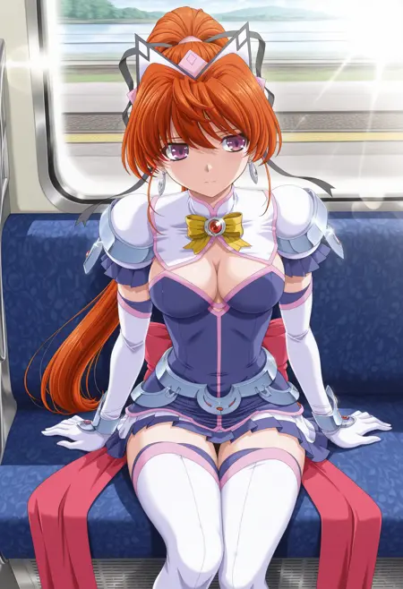 Trigger words: c-lime, orange hair, purple eyes, very long hair, ponytail, tiara, hair ribbon, earrings,
