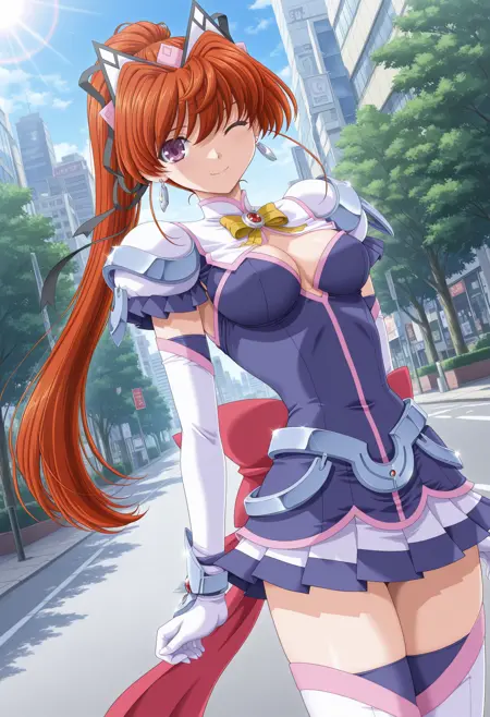 masterpiece, absurdres, newest, 1girl, c-lime, orange hair, purple eyes, very long hair, ponytail, tiara, hair ribbon, earrings, pink detached collar, yellow ribbon, red brooch, blue short dress, puffy short sleeves, elbow gloves, miniskirt, thigh boots, day, city, looking at viewer, cowboy shot,