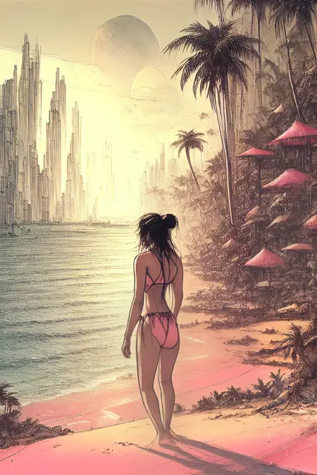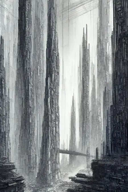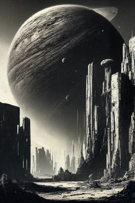 科幻速写风格旨在生成粗糙的钢笔速写风格,同时也能生成未来感的场景、自然环境、太空、恐怖的怪物、巨大的机甲和具有美感的人物。