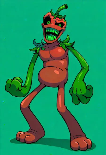 | 학습된 단어 | PepB3NF, 1boy, large, tall, traces of a pepper, red head is shaped like a pepper, green stem on head, green eyes, black sclera, colored sclera, long green teeth, colored teeth, green tongue, colored tongue, red body, stem shaped green neck, stem shaped long arms,복사됨! |