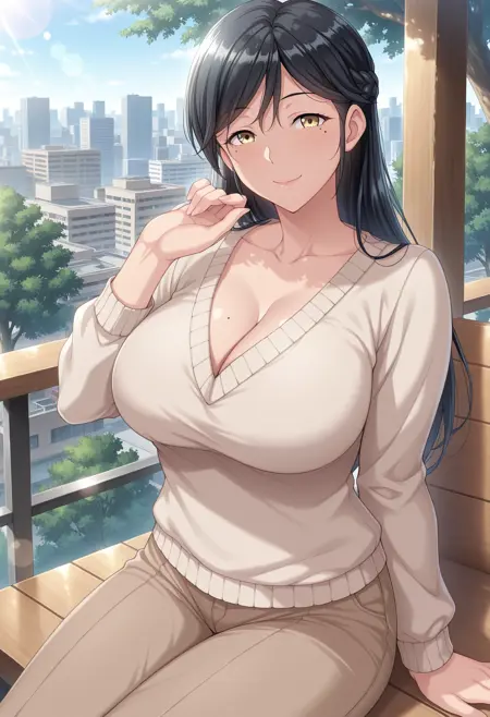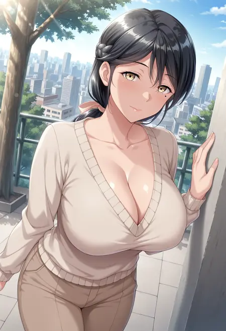 masterpiece, absurdres, newest, 1girl, solo, c-kousaka, mature female, black hair, yellow eyes, braid, low-tied long hair, hair bow, mole, beige sweater, brown pants, puffy long sleeves, cleavage, untucked shirt, lens flare, city, tree, looking at viewer, outdoors, sitting,