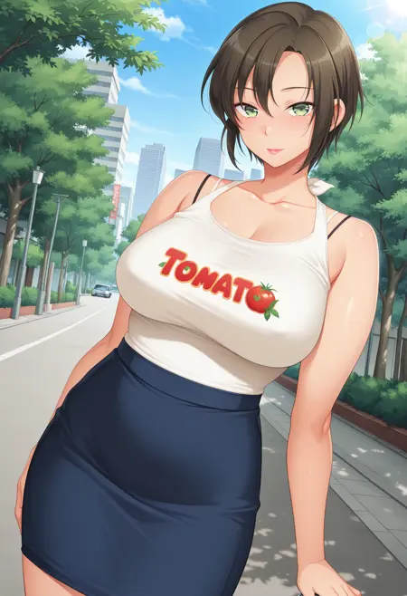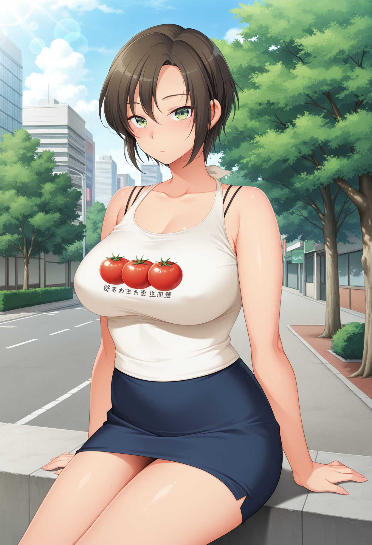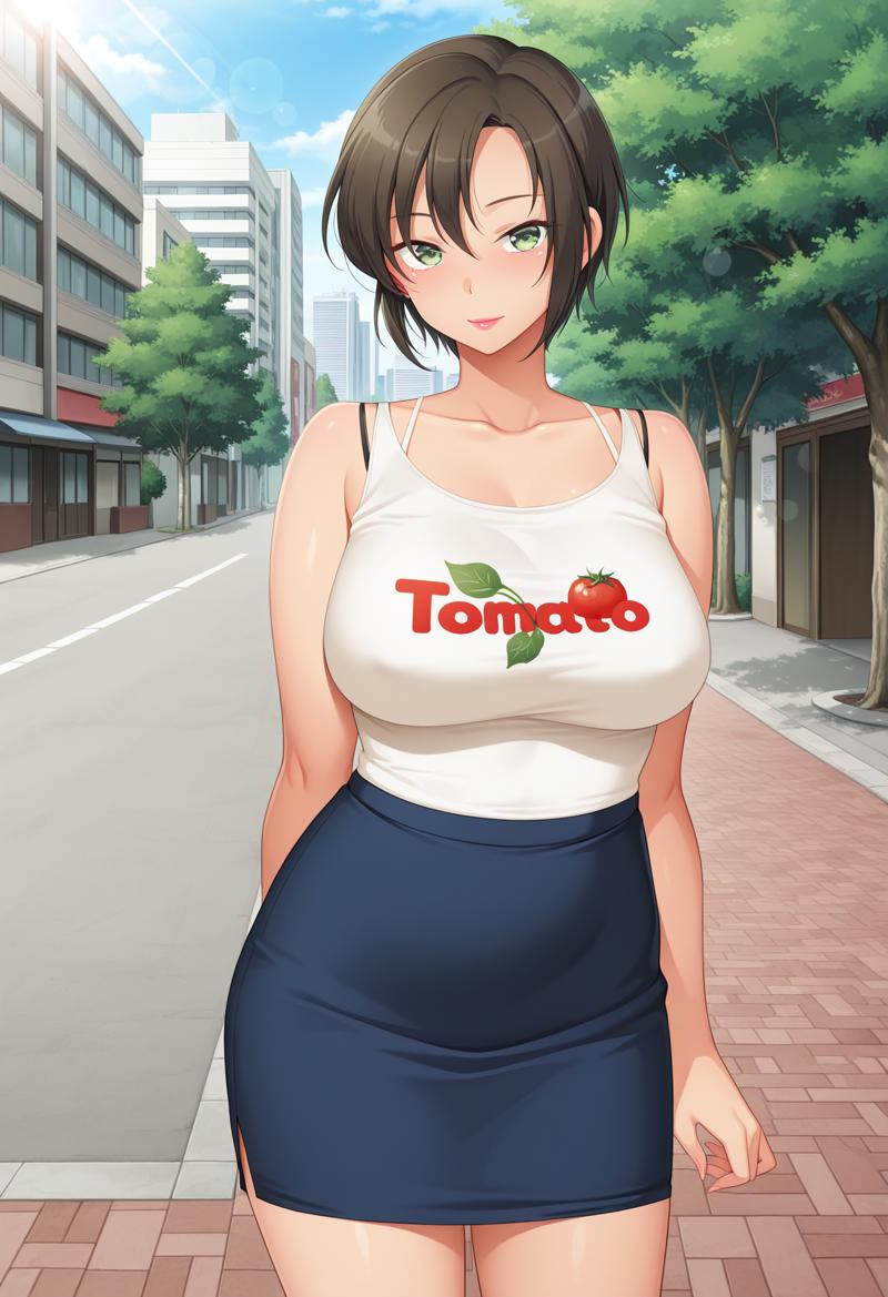 masterpiece, absurdres, newest, 1girl, solo, c-sasahara, mature female, short hair, brown hair, green eyes, clothes writing "tomato", white tank top, blue skirt, pencil skirt, bra strap, looking at viewer, day, lens flare, city, tree, outdoors,