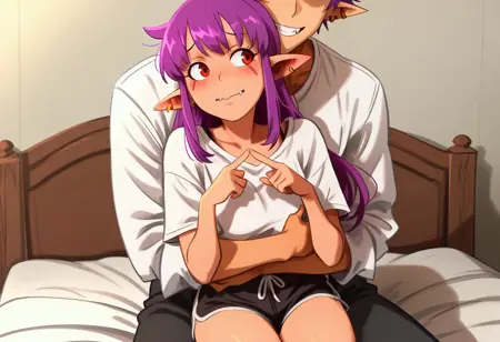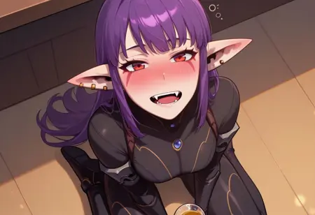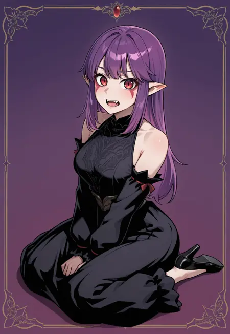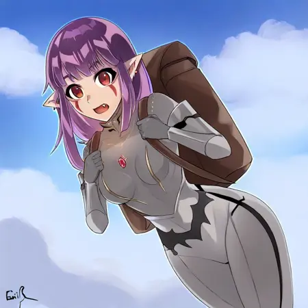 "Esil is a demon girl with long purple hair, large red eyes, sharp red eye markings, and pronounced canines. She also has a very youthful and human-like appearance, as noted by Jinwoo when he first encountered her in the Demon Castle. In her first appearance, she wore a short red cape and white armor decorated with red paint. During her time climbing the Demon Castle's upper floors, she wore gray armor decorated with blue paint and black plates of armor over her chest, shoulders, and upper arms."