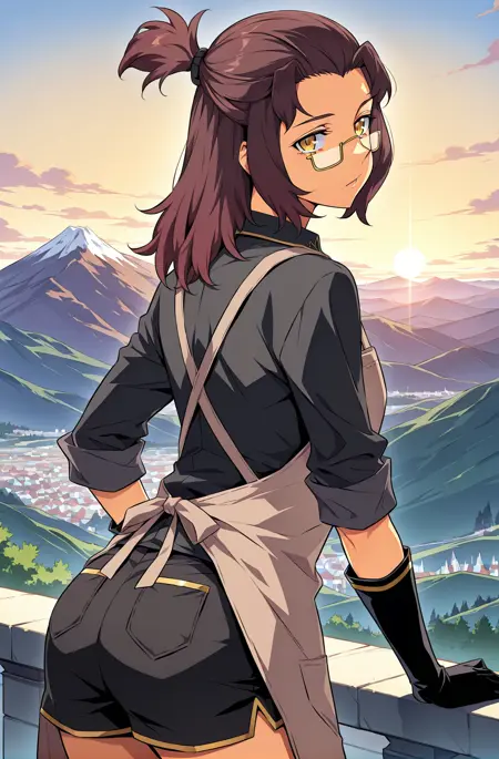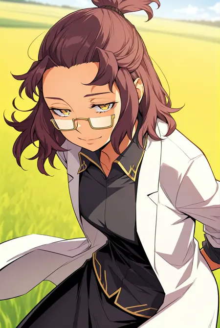 | トレーニングワード | Adelia, 1 girl, solo, light brown skin, golden eyes, medium-length hair, brown hair, hair up, half updo, forehead hair tufts, glasses, rectangular glasses,コピーしました! Adelia_outfit1, black collared shirt, short black skirt, gold trim, white lab coat, open coat, rolled-up sleeves,コピーしました! Adelia_outfit2, black collared shirt, gold trim, rolled-up sleeves, light brown apron, utility apron, black shorts, black gloves, long gloves, white sock, brown sandal,コピーしました! |