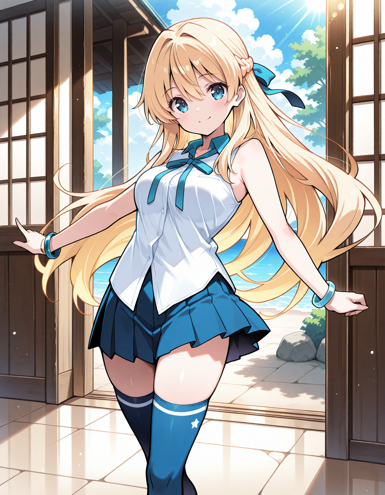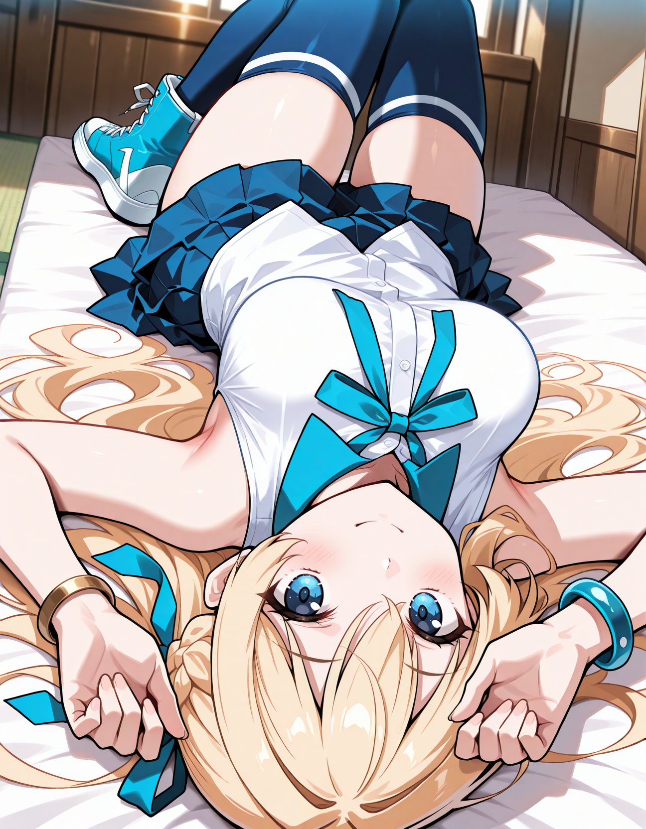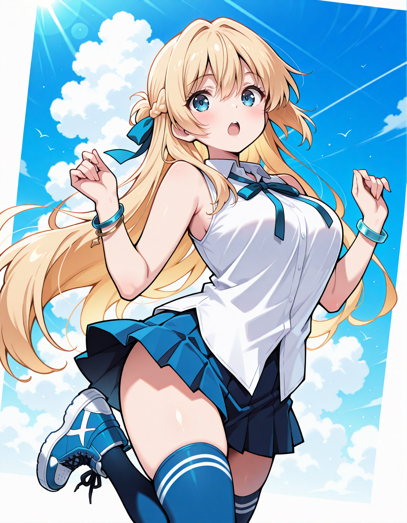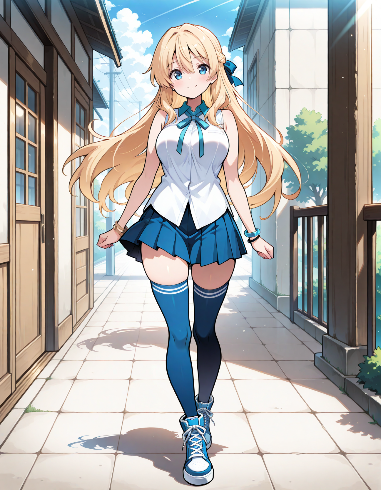 MCMarinaCas, 青い目, 金髪, フレンチブラインド, ハーフアップ, 非常に長い髪, ヘアリボン, 青いリボン, ポロシャツ, 腕なしシャツ, 白いシャツ, 青いネックリボン, 複数のブレスレット, 青いブレスレット, 青いスカート, プリーツスカート, 青いハイソックス, ゼッタイリョウイキ, 青いハイトップ