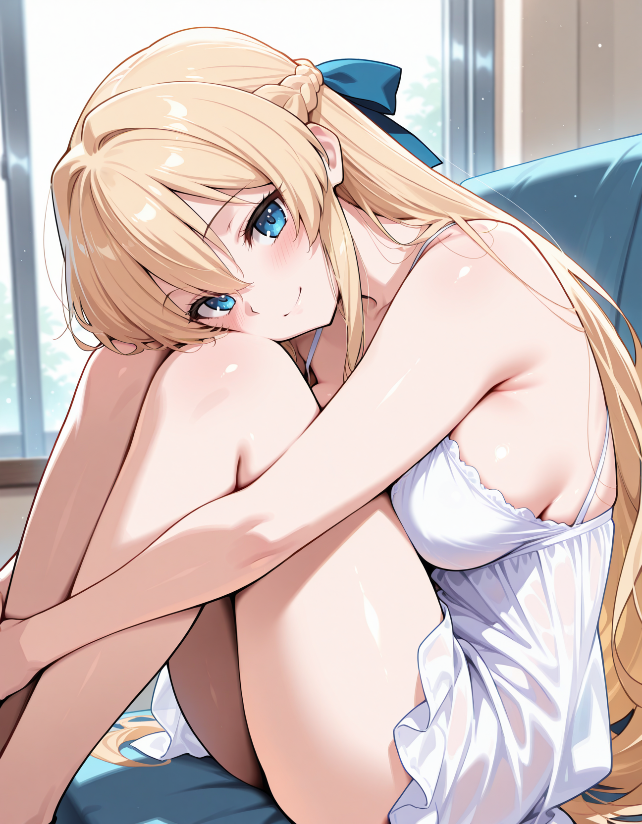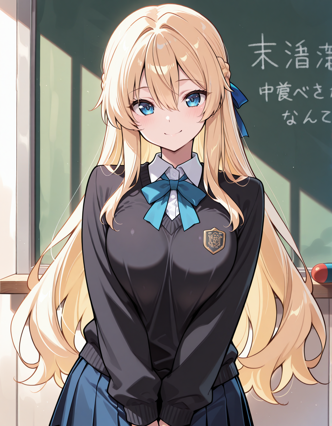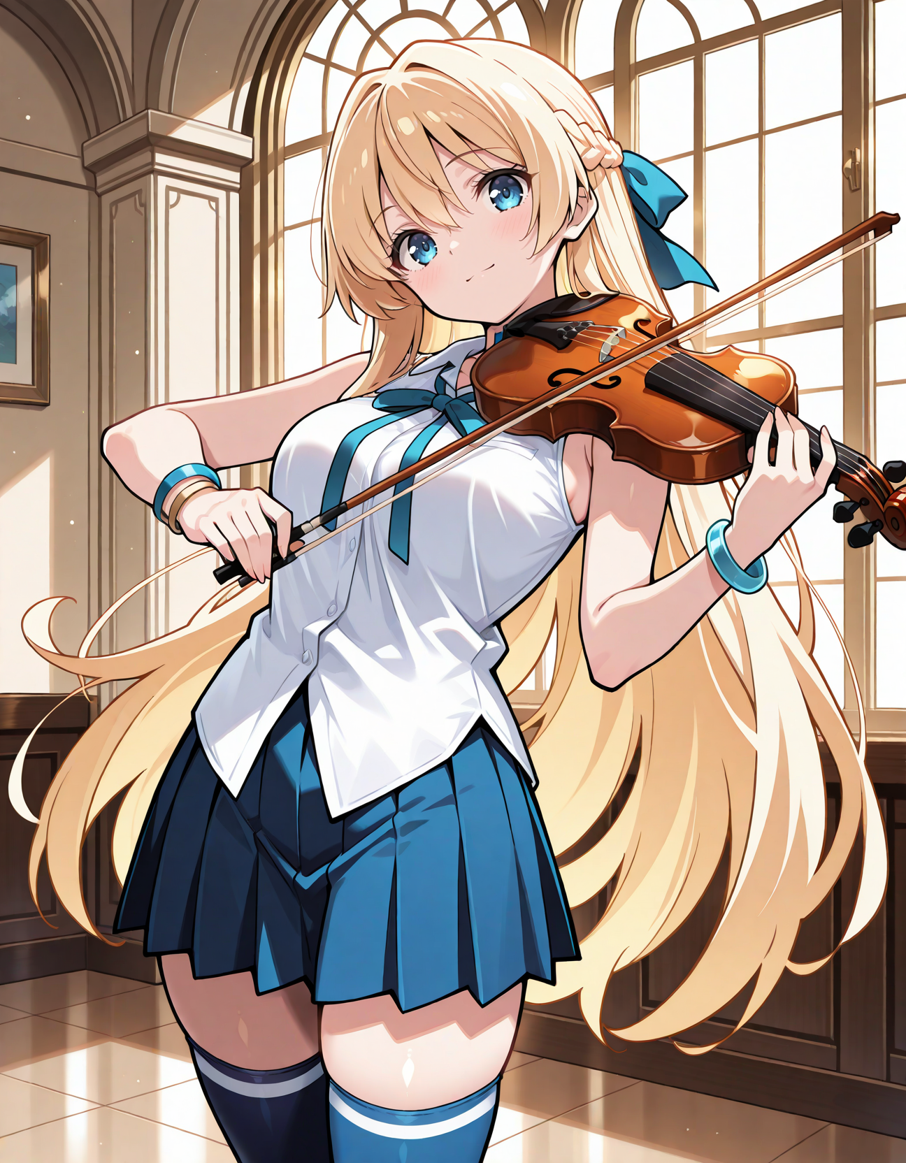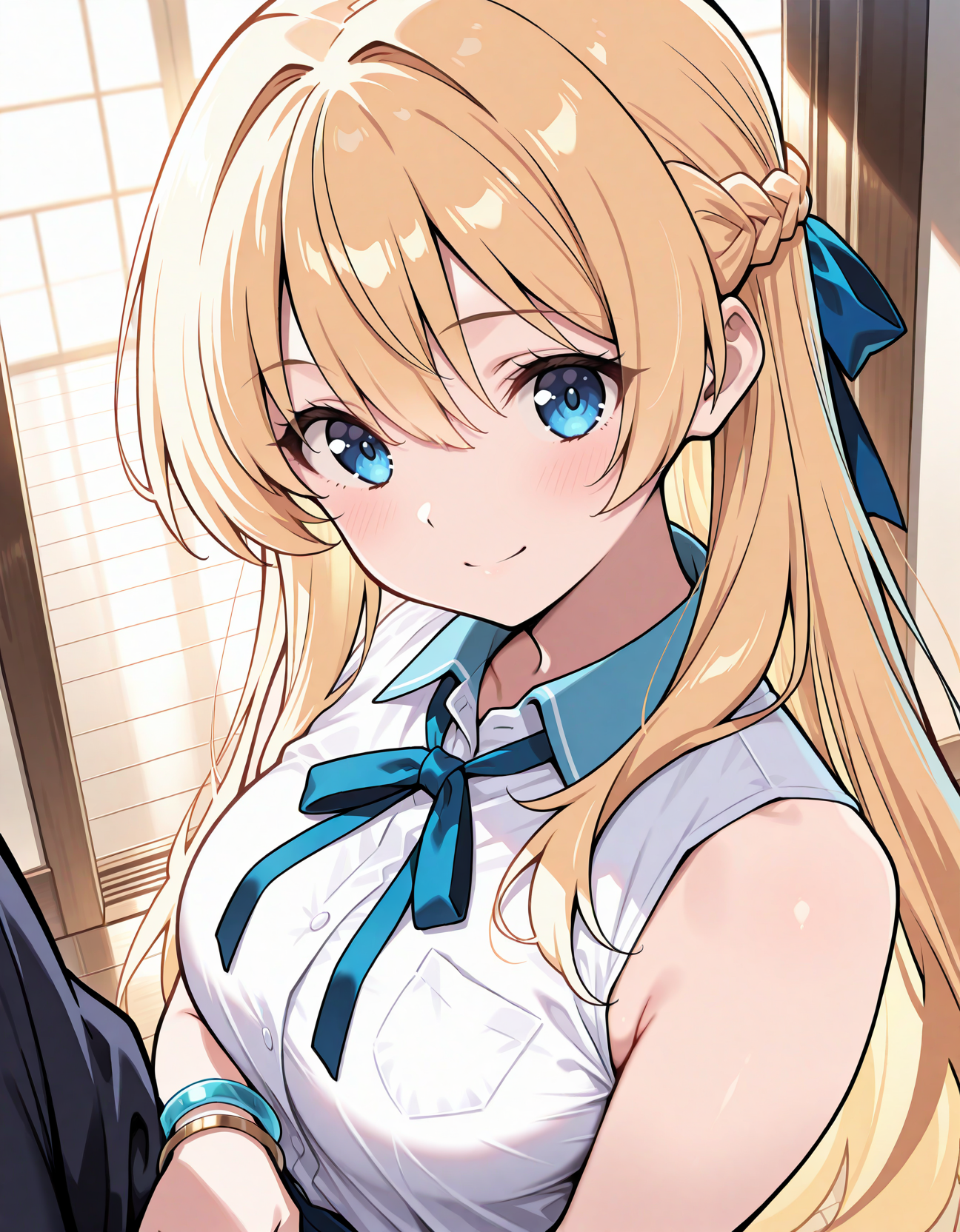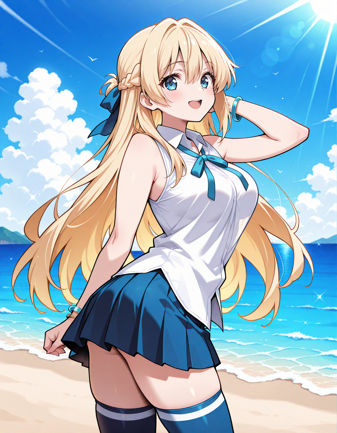 MCMarinaCas, 青い目, 金髪, フレンチブラインド, ハーフアップ, 非常に長い髪, ヘアリボン, 青いリボン, ポロシャツ, 腕なしシャツ, 白いシャツ, 青いネックリボン, 複数のブレスレット, 青いブレスレット, 青いスカート, プリーツスカート, 青いハイソックス, ゼッタイリョウイキ, 青いハイトップ