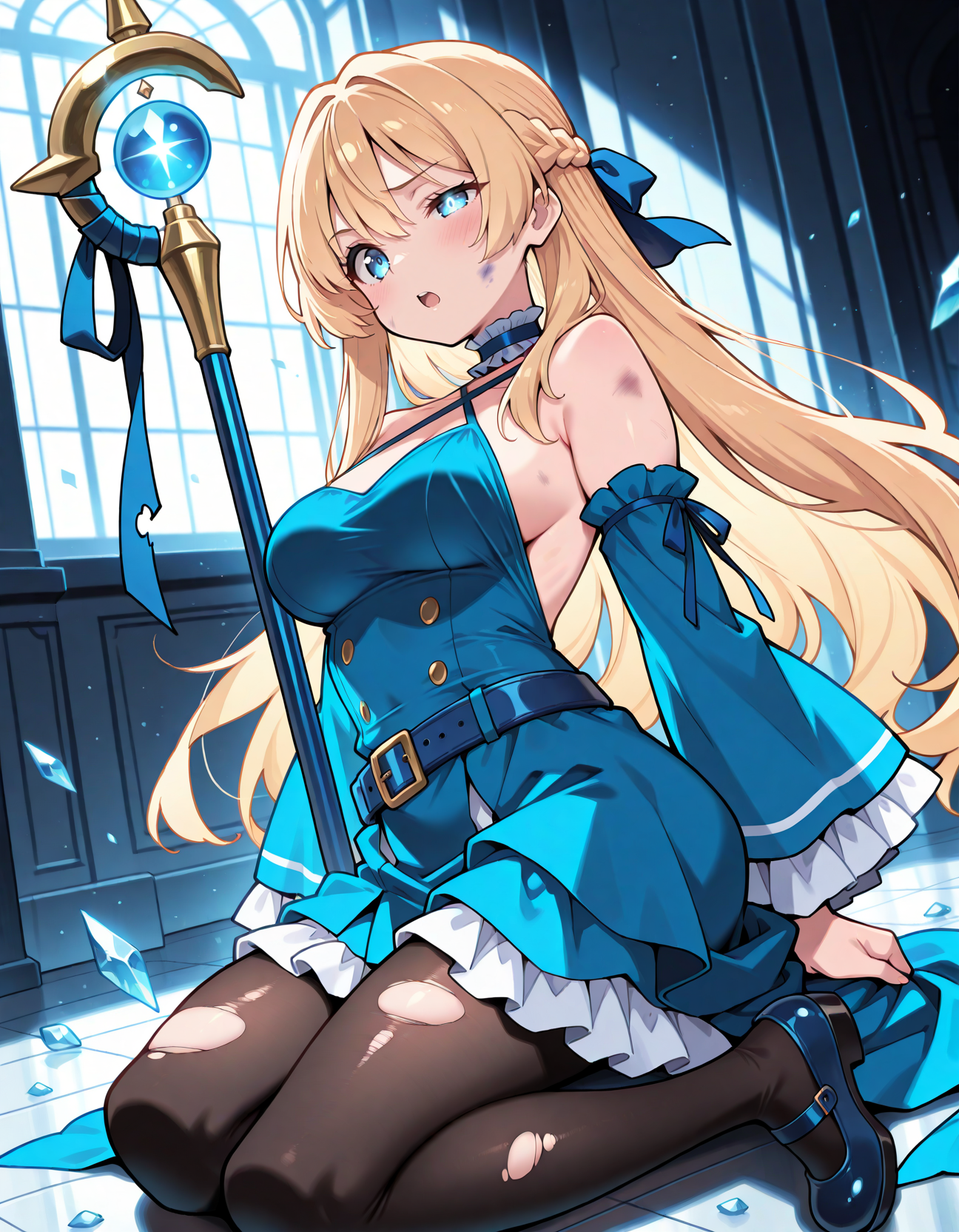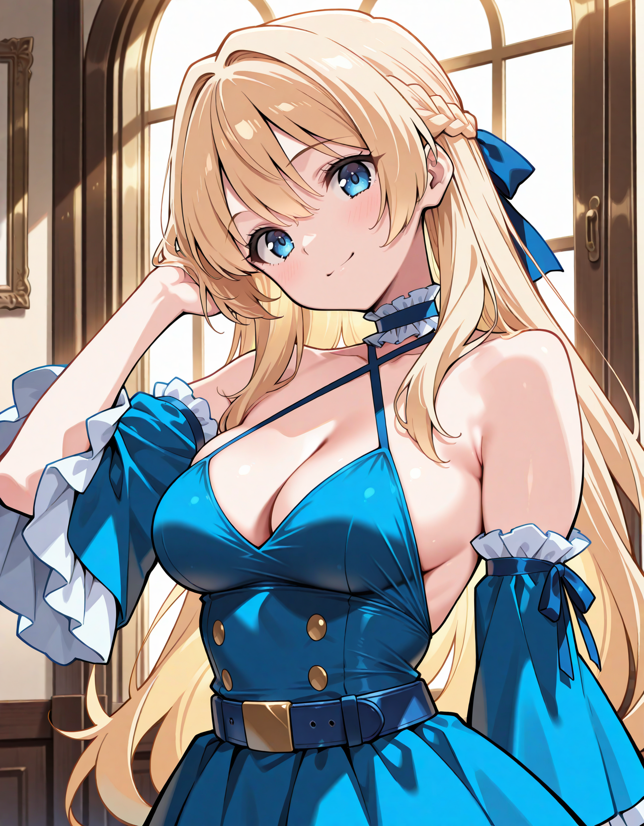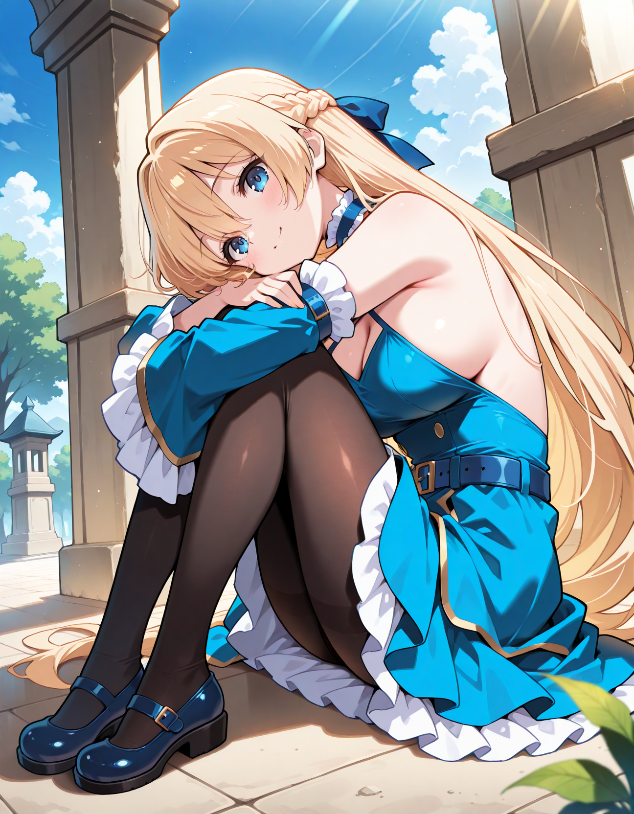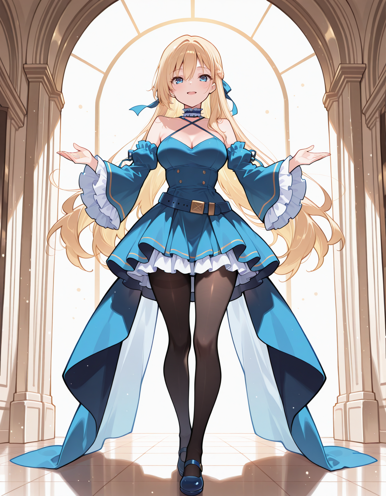 MCMarinaAwk, 青い目, 金髪, フレンチブラインド, ハーフアップ, 非常に長い髪, ヘアリボン, 青いリボン, フリルの首輪, 青い首輪, クロスハルター, 腕なしドレス, 背中が空いたドレス, フリルのドレス, ツートーンドレス, 青いドレス, レイヤードドレス, 外付けの袖, フリルの袖, 広い袖, 青い袖, 青いベルト, 黒いパンスト, メアリージェーンズ, 青い靴