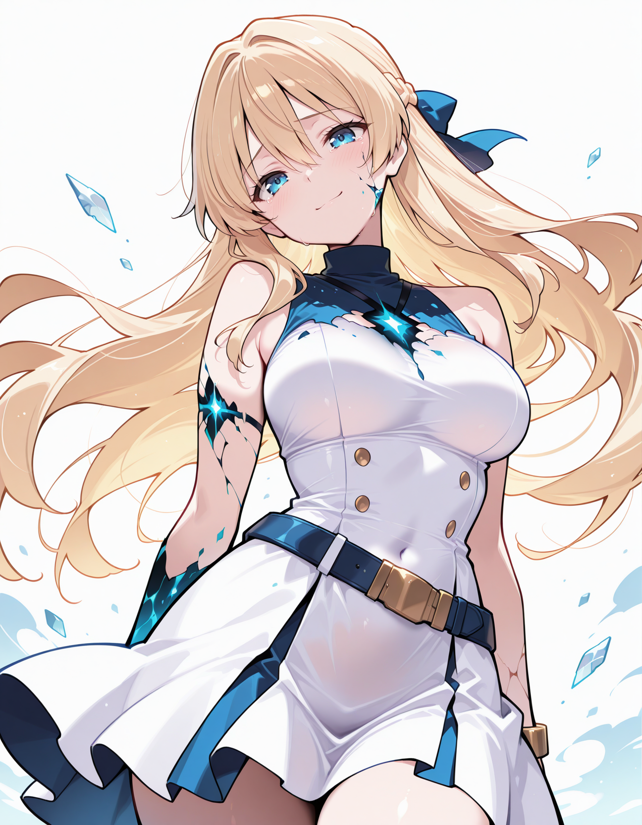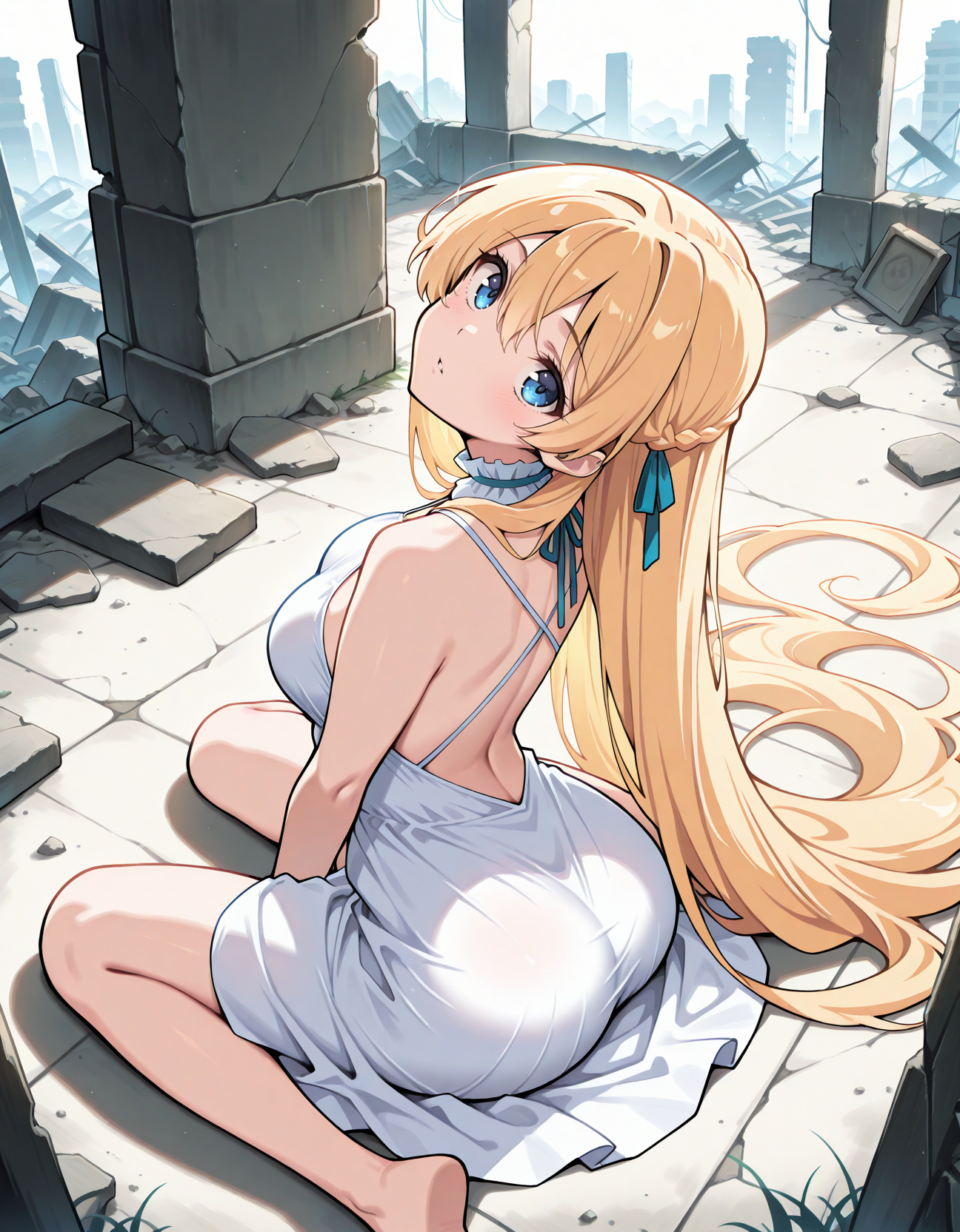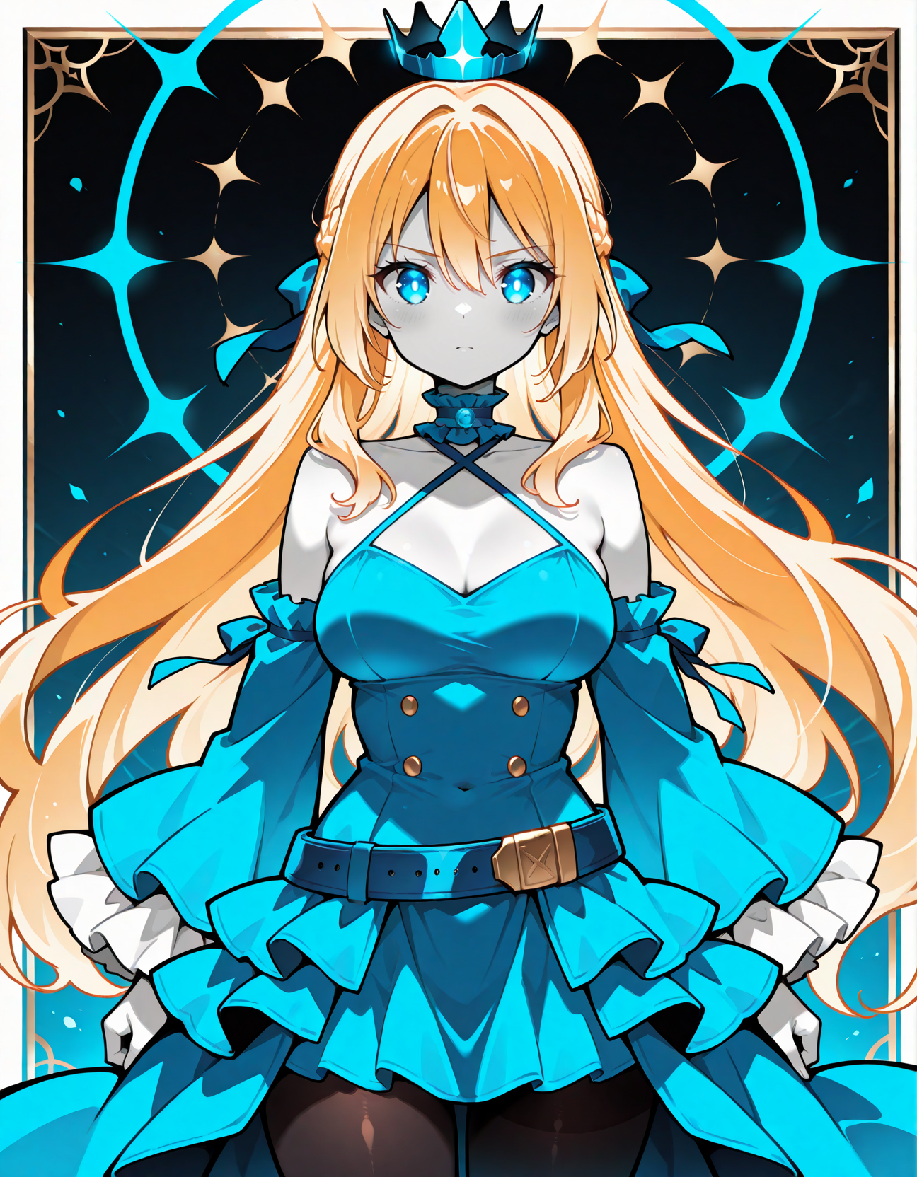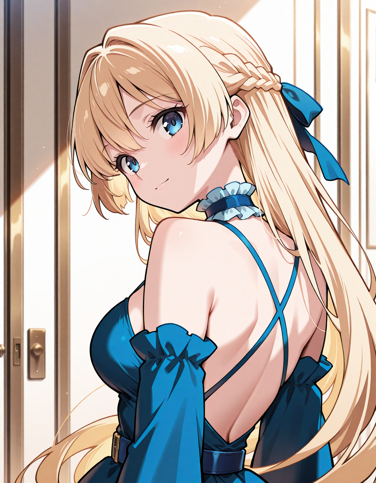 MCMarinaAwk, 青い目, 金髪, フレンチブラインド, ハーフアップ, 非常に長い髪, ヘアリボン, 青いリボン, フリルの首輪, 青い首輪, クロスハルター, 腕なしドレス, 背中が空いたドレス, フリルのドレス, ツートーンドレス, 青いドレス, レイヤードドレス, 外付けの袖, フリルの袖, 広い袖, 青い袖, 青いベルト, 黒いパンスト, メアリージェーンズ, 青い靴