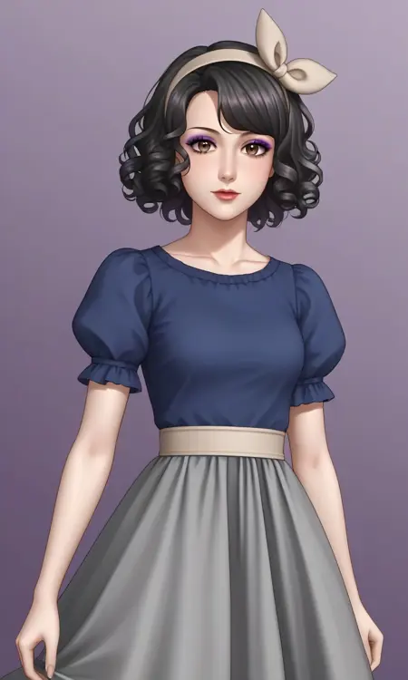 1woman, black hair, bob cut, curly hair, brown eyes, makeup, blue jacket, blazer, gray sweater, turtleneck, beige pants