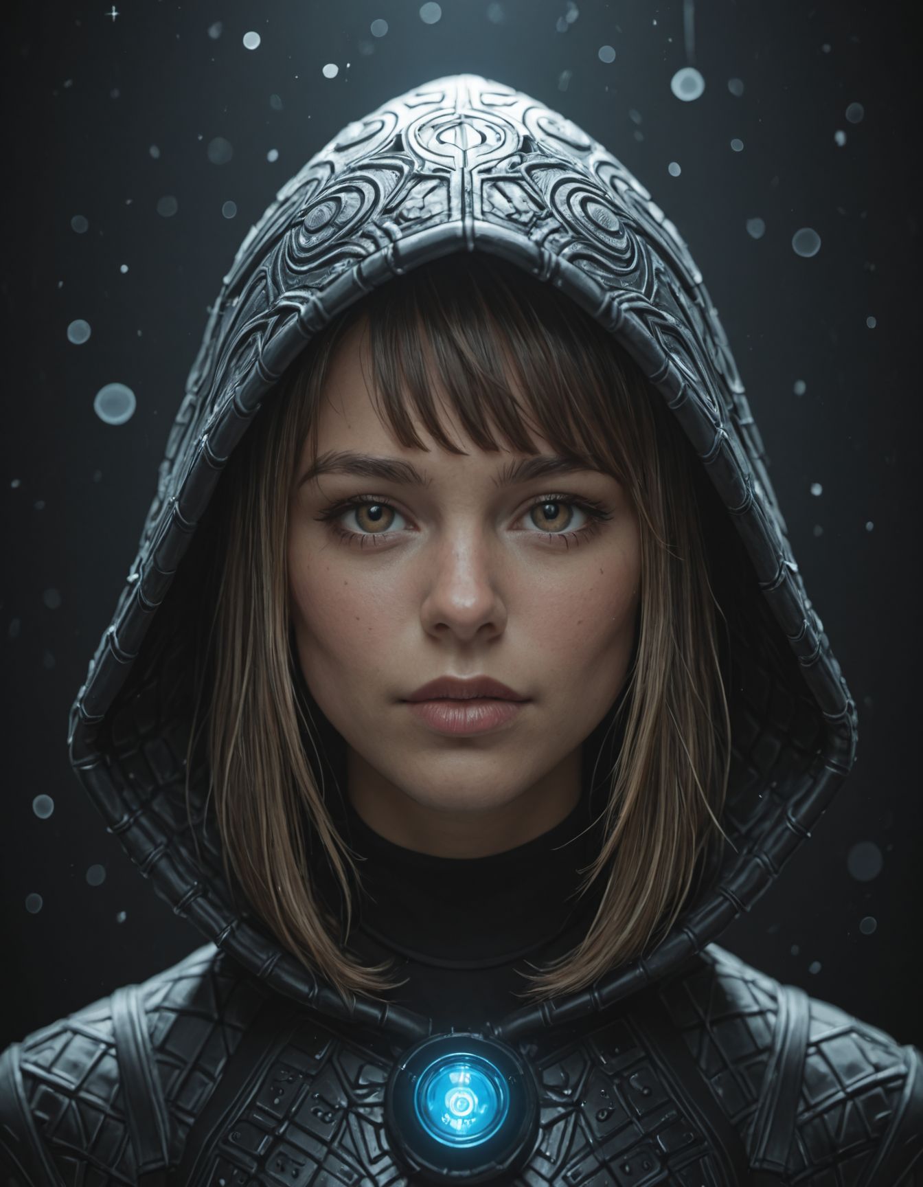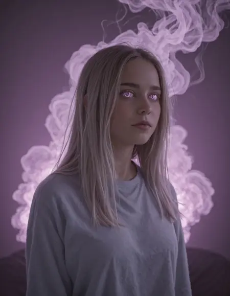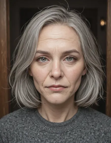 Old woman, grey hair, wrinkled face, glassy stare, very old, wise, wearing a sweater,