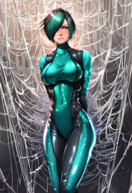 Jade: "jade, 发丝遮住一只眼, 短发, 多色发, 黑发, 绿发, 双色发, 绿眼, 大胸, 连体衣,"