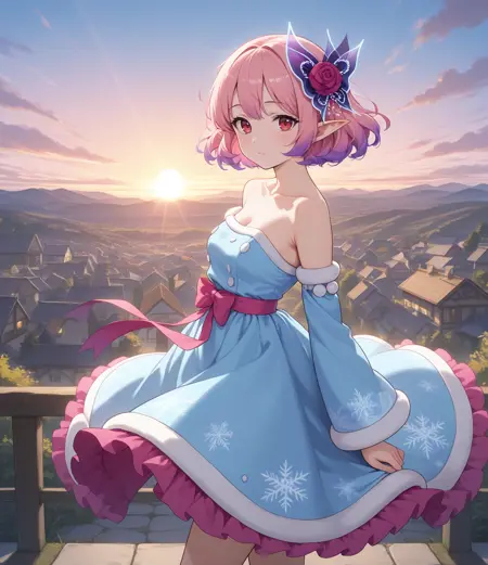Outfit: blue dress, strapless, waist ribbon, pink frills, detached sleeves, bare shoulders, blue shoes, blue sleeves, collarbone, snowflake print, fur-trimmed sleeves, hair ornament, butterfly hair ornament, hair flower, rose, double-breasted, white buttons
