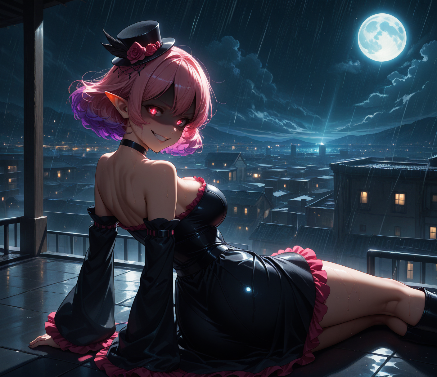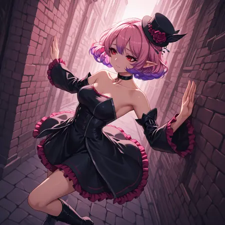 Appearance: gradient hair, pink hair, purple hair, pointy ears, short hair, red eyes