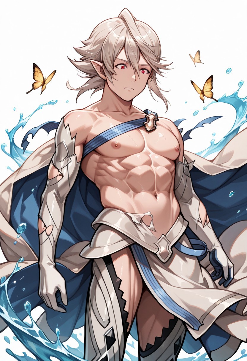 corrin, adrift, 1boy, 男性焦点, 白发, 发丝, 尖耳, 红眼, 手套, 蝴蝶, 赤脚, 无指手套, 肘部手套, 水效果, 元素能量, 气泡, 胸肌, 肌肉发达, 腹肌, 肌肉男性