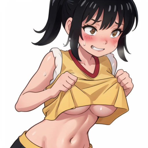 提示词:"black tied hair", "yellow sleeveless shirt", "red shorts"