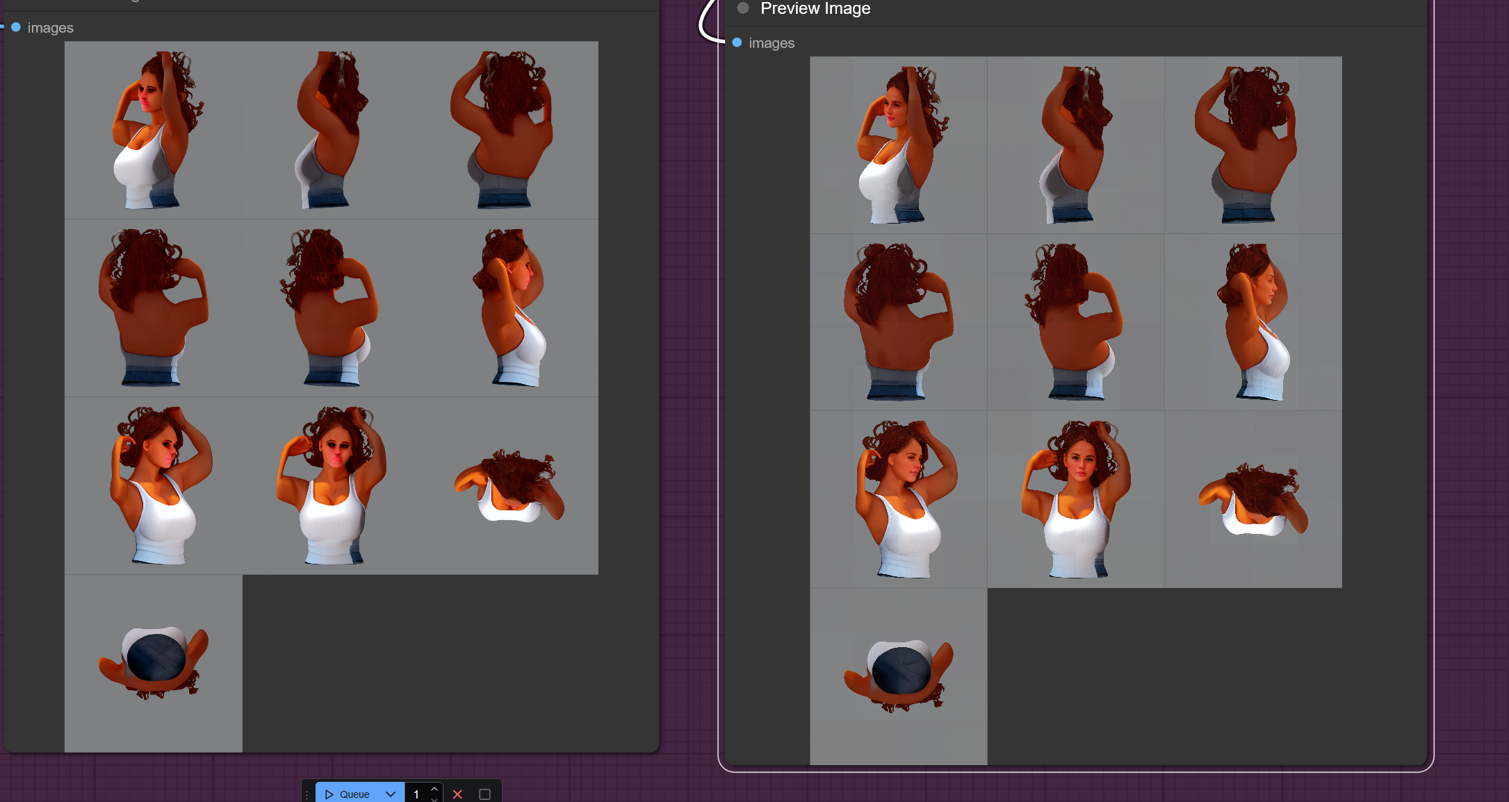 Kijai 提供了一个很好的起点,而我在此基础上进一步扩展。事实证明——3D 建模部分来得又快又容易,真正困难的是正确地进行纹理处理。我花了很长时间才找到正确的摄像机流程,并研究如何对纹理进行超分辨率处理,以便在贴图后呈现出明显更佳的效果。