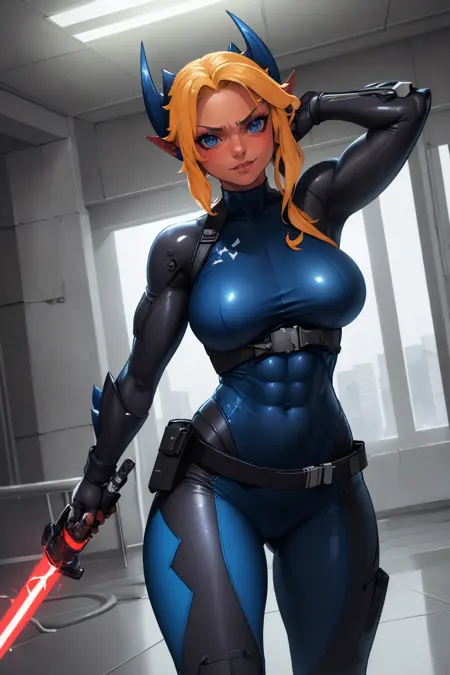 트리거: **"Arklai, colored skin"**은 항상 필요합니다. 정확성과 일관성을 위해 "파란 눈, 꼬리, 근육질, 복근"을 추가하세요.