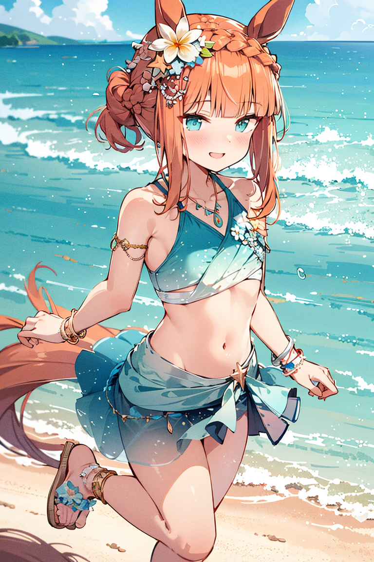 - horse girl,horse ears,horse tail,hair ornament,blunt bangs,official alternate costume,blue bikini,blue skirt,navel,jewelry,necklace,bracelet,see-through,sarong,single hair bun,aqua eyes,long hair,orange hair,sidelocks,hair flower,sandals,crown braid,anklet