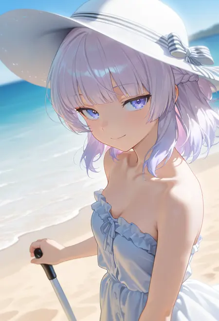 外貌标签: 1girl, solo, 短发, 蓝眼, 紫眼, 发辫, 齐刘海, 渐变发色, 浅紫色头发, 法式发辫, 中等胸部