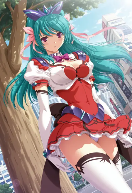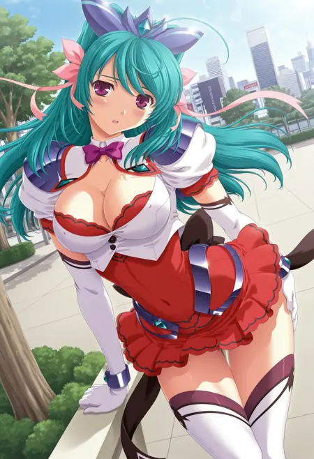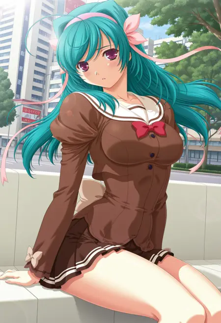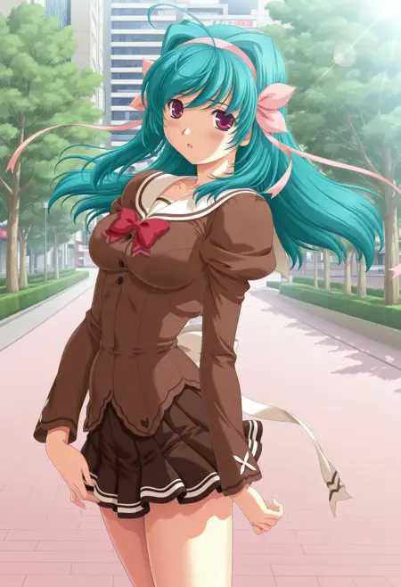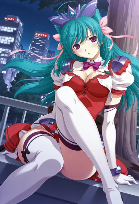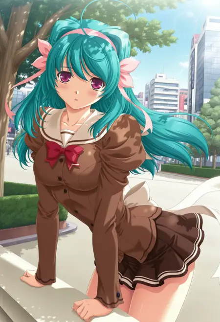 트리거 단어: c-lemmtear, 긴 머리, 청록색 머리, 보라색 눈, 헤어 리본, 관모,