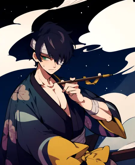 권장 프롬프트: 1boy, green eyes, short hair, black hair, solo, japanese clothes, kimono, hair over one eye, bandages, bandage over one eye, male focus, holding smoking pipe