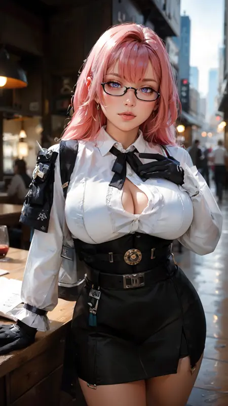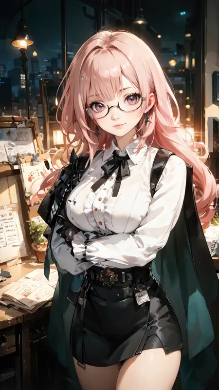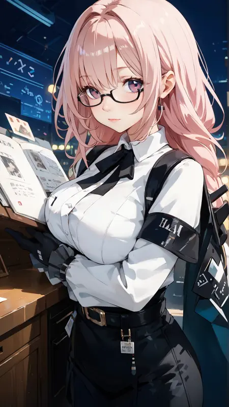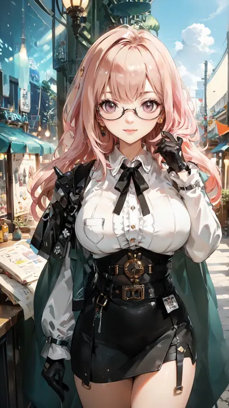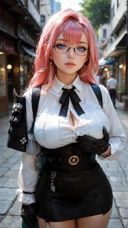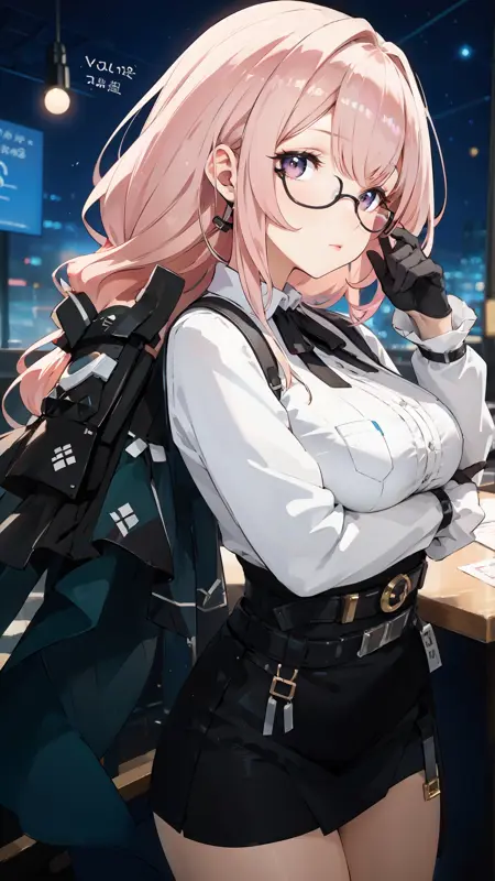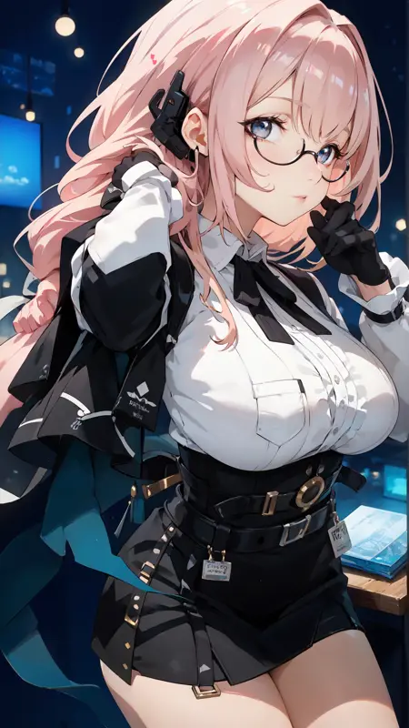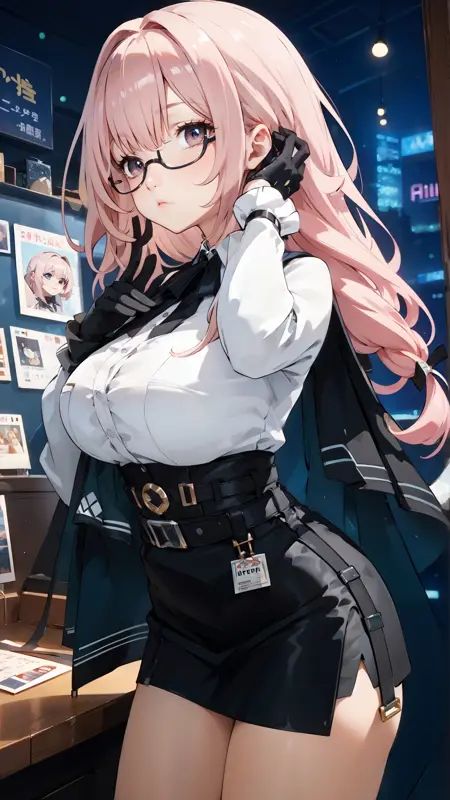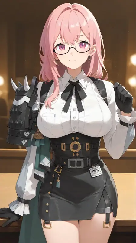 例のプロンプト: "tsukishiro_yanagi_zenless, an anime girl, 1girl, solo, long hair, breasts, looking at viewer, smile, bangs, skirt, large breasts, simple background, shirt, gloves, long sleeves, white background, ribbon, closed mouth, white shirt, pink hair, cowboy shot, glasses, black gloves, collared shirt, belt, black skirt, pink eyes, black ribbon, neck ribbon"