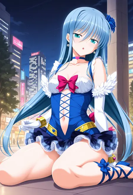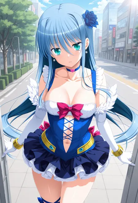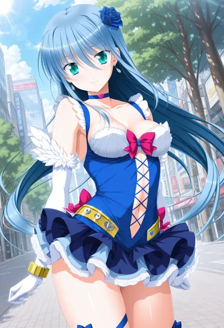 masterpiece, absurdres, newest, 1girl, solo, c-ruri, long hair, blue hair, aqua eyes, hair flower, heart choker, earrings, blue short dress, cross-laced dress, miniskirt, pink bowtie, elbow gloves, gold bracelet, cross-laced footwear, navel, city, day, lens flare, tree, looking at viewer,
