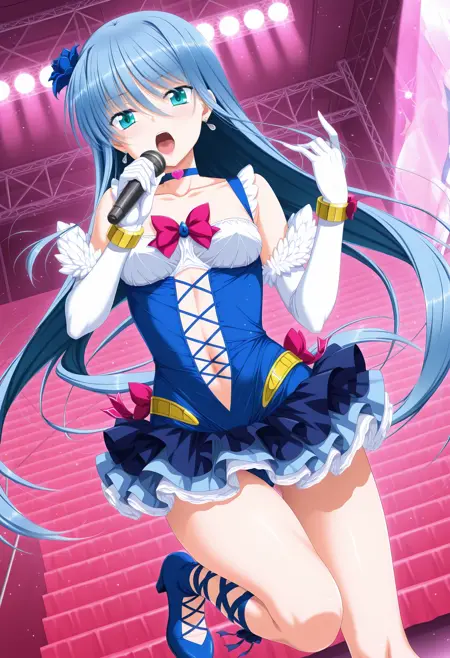 衣装: ハート型のチョーカー、イヤリング、青いショートドレス、クロスレースのドレス、ミニスカート、ピンクのボウタイ、肘まである手袋、ゴールドのブレスレット、クロスレースの靴、へそ、