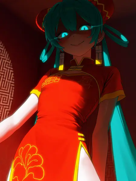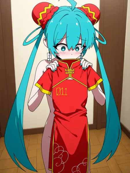chinamiku, hatsune miku, red dress, chinese clothes, cleavage cutout, white socks, flats
