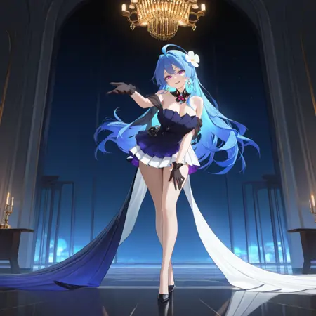 HelenaAzur, Fol003, Hln_Dnc, purple eyes, blue hair, long hair, ahoge, off-shoulder dress, dark blue dress, gradient dress, white flower, pleated skirt, white skirt, layered dress, flower hair ornament, black sleeves, short sleeves, bare shoulders, detached collar, frilled gloves, black gloves, earrings, cleavage,