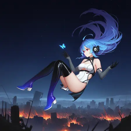 HelenaAzur, Fol001, Hln_Rtf, purple eyes, blue hair, long hair, ahoge, rudder footwear, dark blue legwear, thigh boots, garter straps, halter dress, blue sides, multicolored dress, white halter top, miniskirt, white dress, bare shoulders, armored collar, white hairclip, long gloves, two-tone gloves, black gloves, blue gloves, side cutout, armored dress, double-breasted,