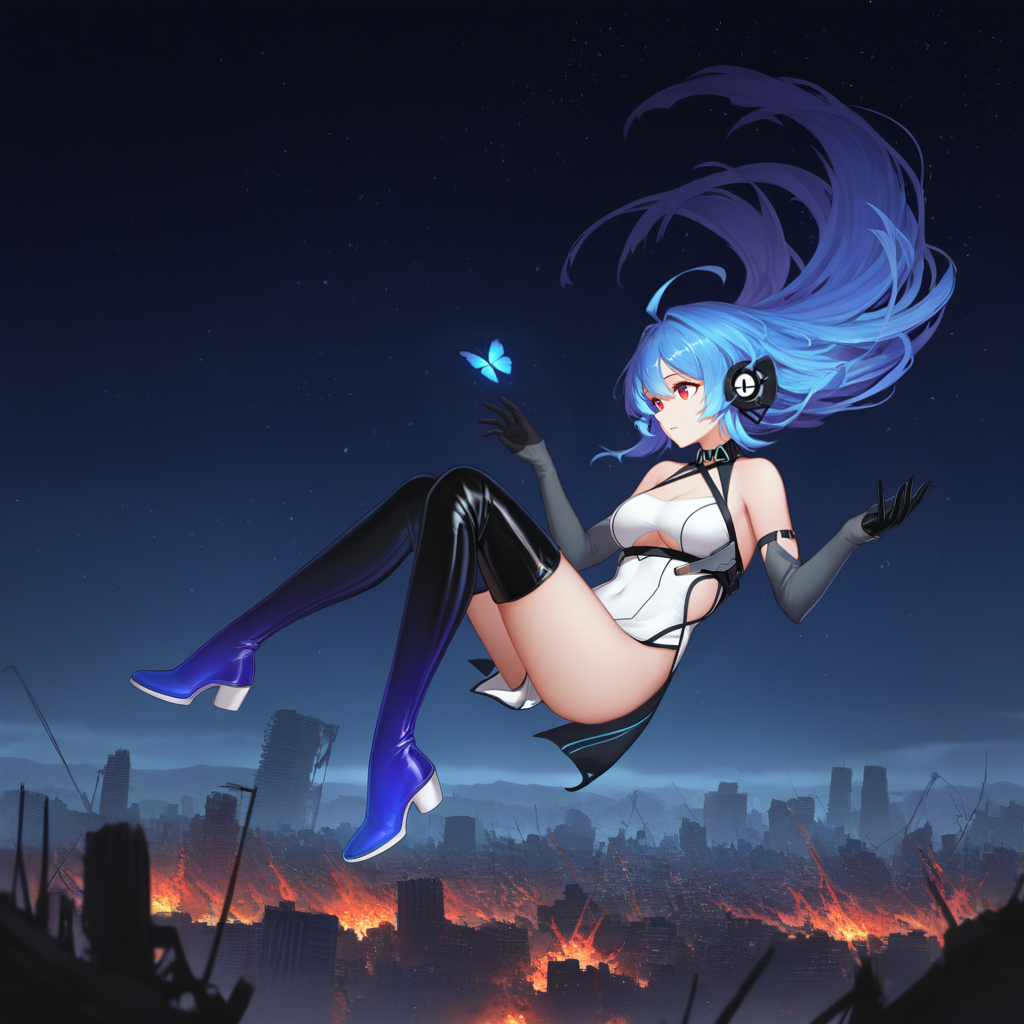 HelenaAzur, Fol004, Hln_Met, red eyes, blue hair, long hair, ahoge, sleeveless dress, underbust, underboob cutout, cleavage cutout, halterneck, white dress, headgear, white pelvic curtain, short pelvic curtain, black turtleneck, side cutout, black waist cape, headphones, arm strap, black strap, black trim, neon trim, black gloves, black thigh boots, gradient footwear, detached sleeves, grey sleeves, long sleeves, sleeves past wrists, bare shoulders, criss-cross straps, covered navel,