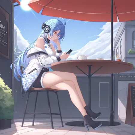 HelenaAzur, Fol004, Hln_Mmr, red eyes, long hair, blue hair, ahoge, ribbed shirt, black turtleneck, sleeveless shirt, halter shirt, white shirt, bare shoulders, white jacket, off-shoulder jacket, print jacket, fur-trimmed shorts, black shorts, short shorts, headphones, open jacket,