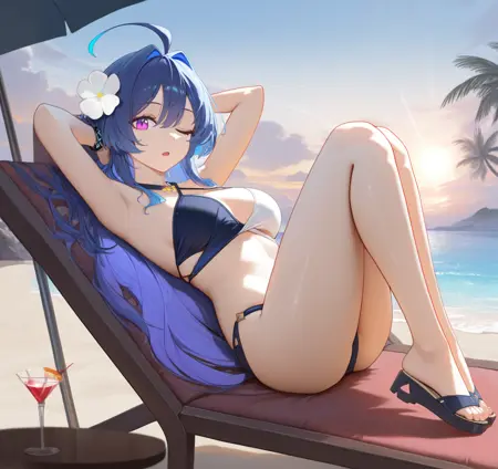 HelenaAzur, Fol003, Hln_Swm, purple eyes, blue hair, long hair, ahoge, white flower, hair flower, string bikini, swimsuit, halter top bikini, criss-cross halter, criss-cross strings, two-tone bikini, white bikini, dark blue bikini, black bracelet, necklace, multi-strapped bikini,
