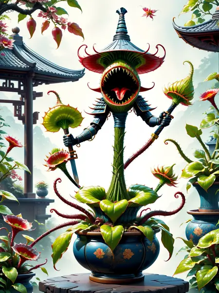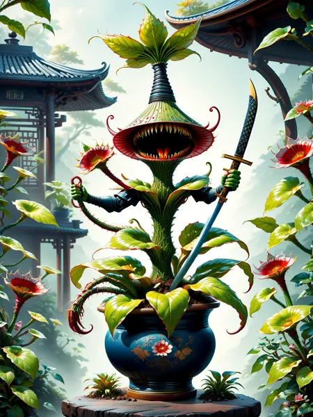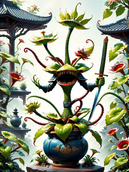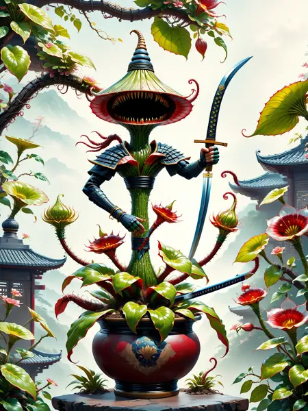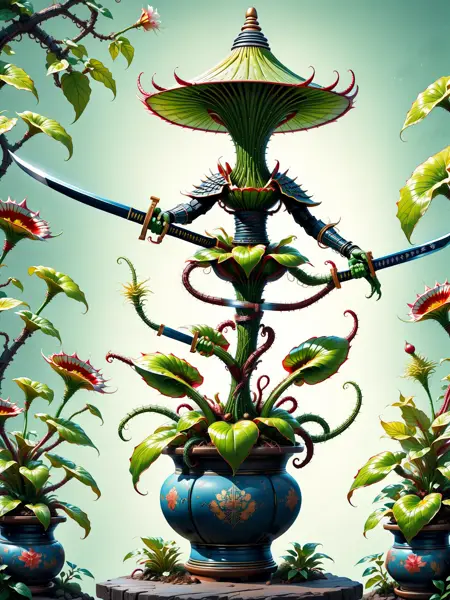 samuCarniv、侍の肉食植物が入った中国製花壺、肉食植物だけで作られ、侍の剣を握っている、侍スタイルの植物、葉で作られた侍の帽子、鋭い歯で叫んでいる、森と空の風景を背景に、剣を振るっている、高精細デジタルイラスト、植物だけで作られている、手は茎でできている、侍肉食植物コンセプト、超現実的な写真
