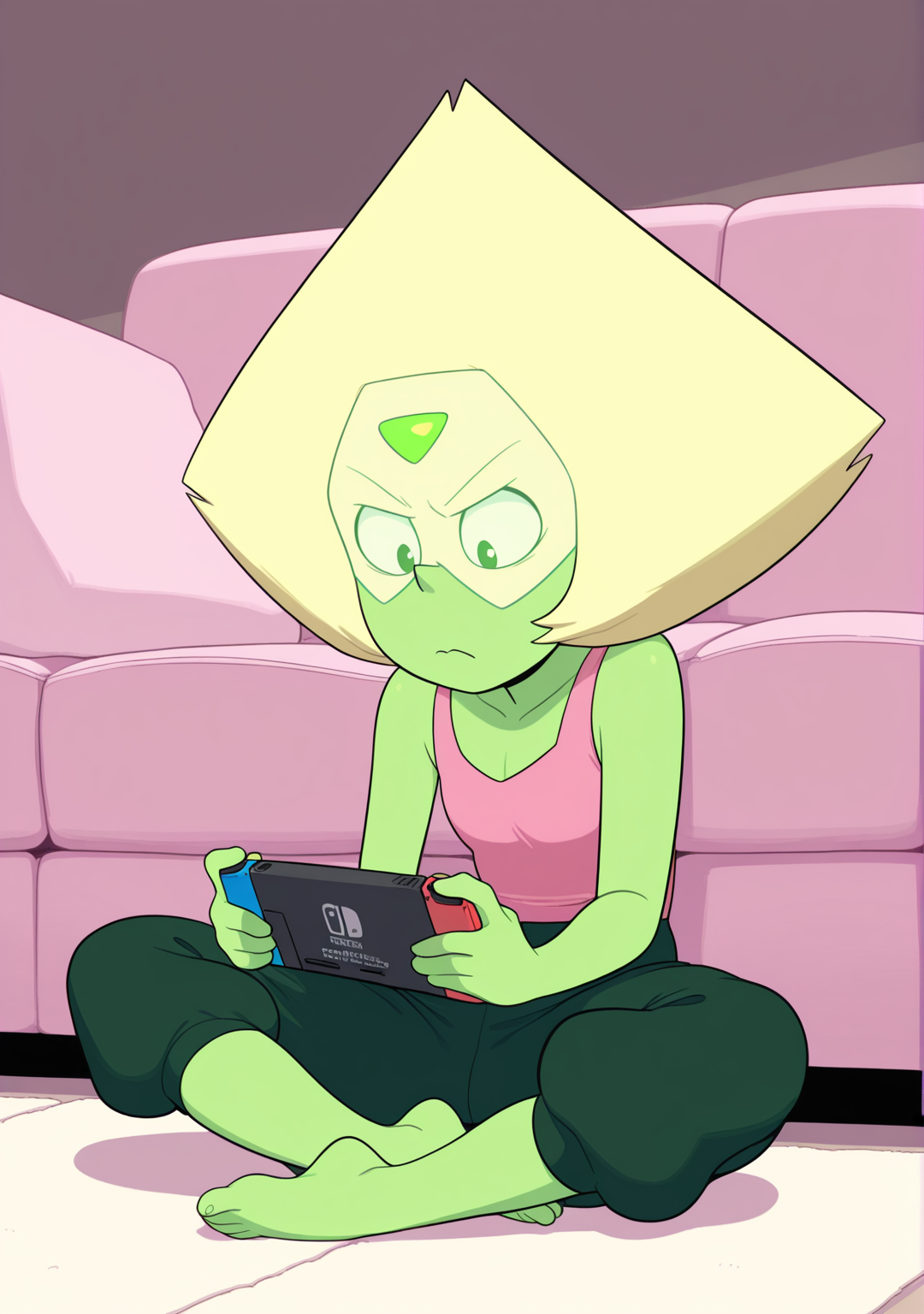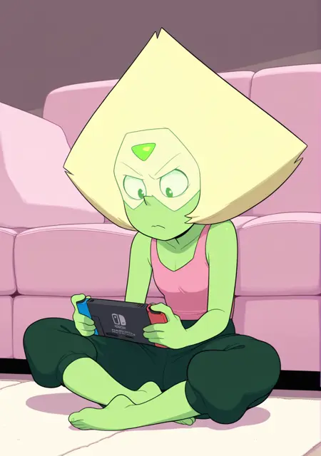 Base Prompts: "IlluPeridot, green skin, forehead jewel, blonde hair, green eyes,"