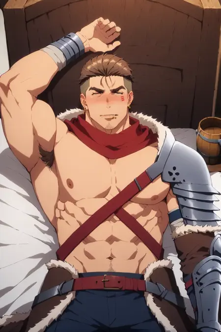 topless,blue pants,red crossbody belt,forearm armor,one shoulder armor,bicep length gloves,hip armor,brown hip coat with white fur trim,red belt,white fur trim,foot armor