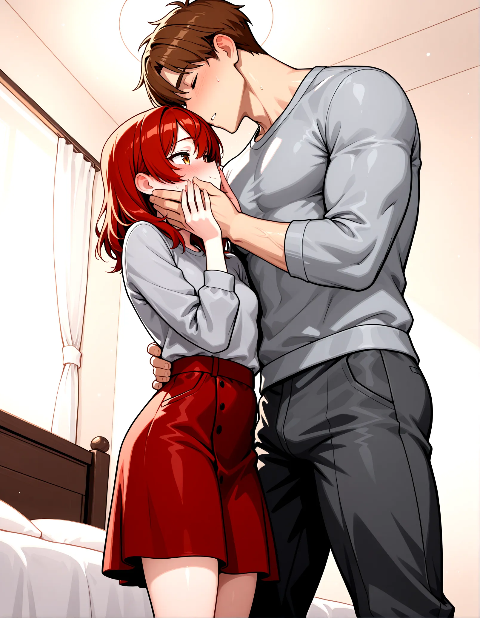 (focus boy,muscler 1 boy) ,Petite 1girl,(Heterosexual,loving coupl:1.2),muscular boy with petite girl,masterpiece, newest, best quality, absurdres, perfect quality, Ultra Detail 8k art, very aesthetic, perfect anatomy,sfw,romantic BREAK(red hair boy), boy wearing white sweatshirt,brown hair girl ,girl wearing Shirt and red skirt,{ 0.5::__Heterosexual_couple/Sensitive__ | 1::__Heterosexual_couple/SWF__ },Bed room,legs out of frame,cowboy Shot,From below<lora:ilbetterh:0.5>