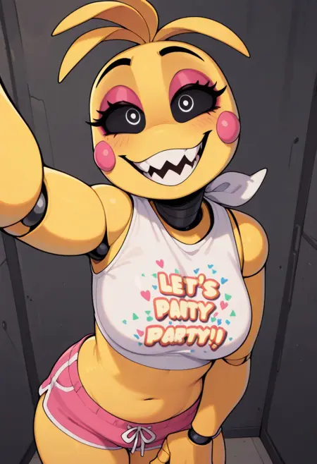 태그: toychica, 퓨리, 노란색 신체, 검은 눈, 볼빨간 흔적, 분홍색 속눈썹, 아이라인, 애니메트로닉, 관절, 날카로운 이빨, 팬티, 크롭탑,