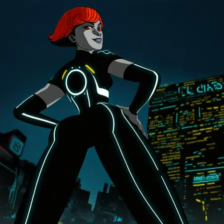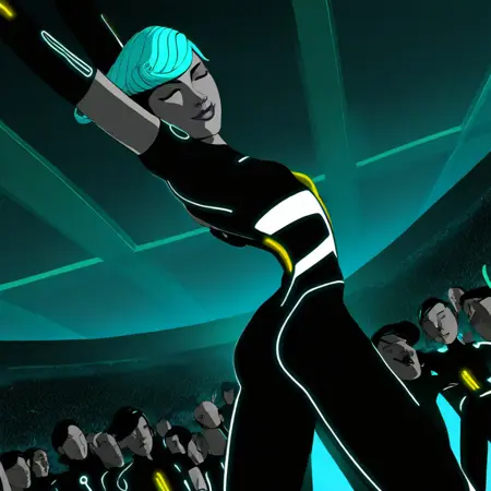 cyan hair, short hair, cyan eyes, black bodysuit, neon lights, long legs, arm sleeves