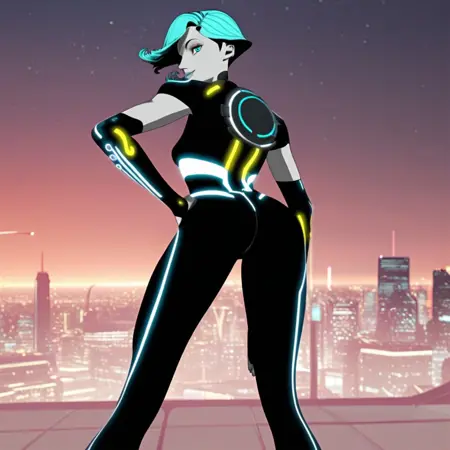 TronMara, cyan hair, short hair, cyan eyes, black bodysuit, neon trim, long legs, arm sleeves, tron disc,