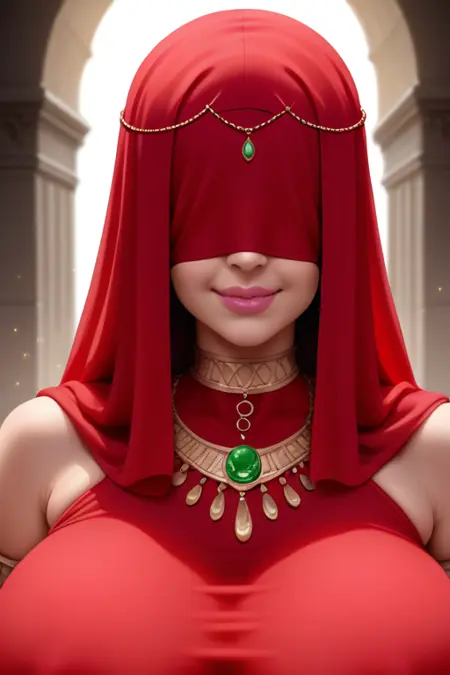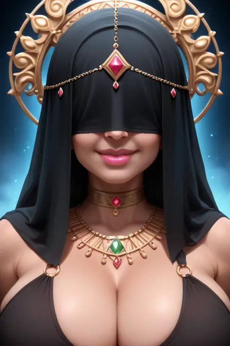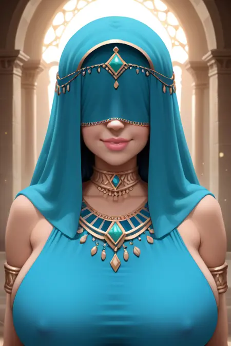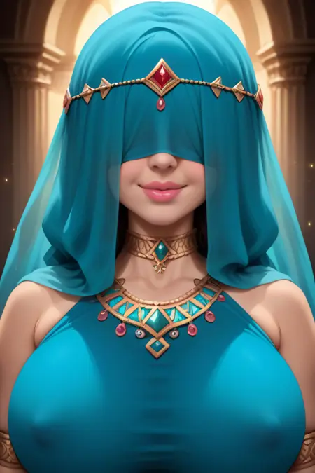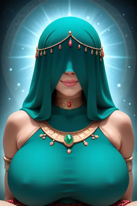 1girl,arabian queen,( face veil:1),,masterpiece, high quality,light particle, looking at viewer,(masterpiece:1.2),(best quality:1.2), royal, velvet, cyan clothes,upper body,realistic,detailed , squatting, huge breast,