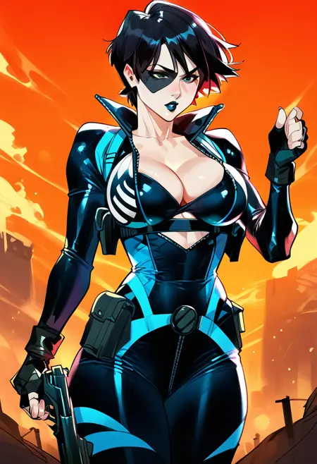 dominopony, black hair, short hair, breasts, cleavage, bodysuit, colored skin female, handgun, fingerless gloves