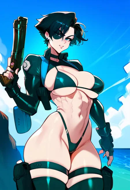 트리거: dominopony, 검은 머리, 단발, 가슴, 젖가슴 사이, 바디수트, 색상이 있는 피부를 가진 여자, 권총, 손가락 없는 장갑