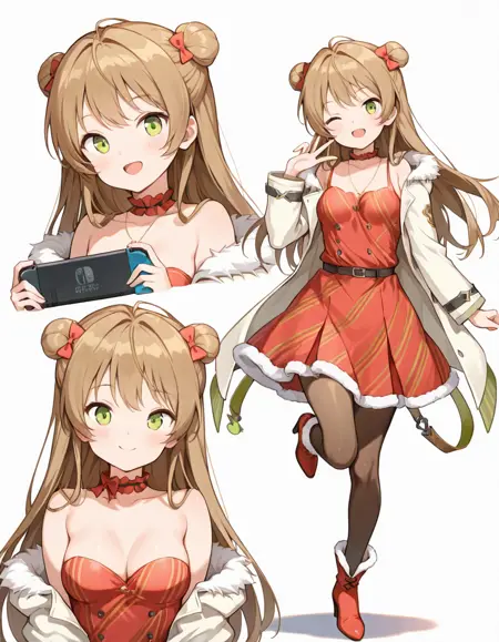 RFBxmas, xmas_bow_choker, xmas_coat, xmas_belt, xmas_high_heel_boots, xmas_hair_bow, xmas_pantyhose, xmas_stripped_dress