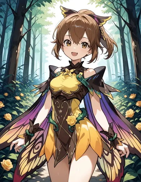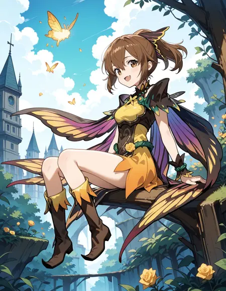 그녀의 화려한 외모를 위해 "butterfly wings,fairy hair ribbon,fairy cape,fairy dress,yellow rose,wrist cuffs,fairy boots"를 추가하세요.