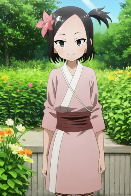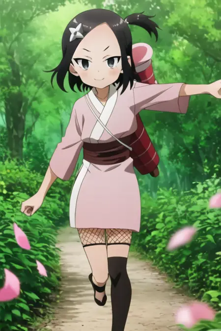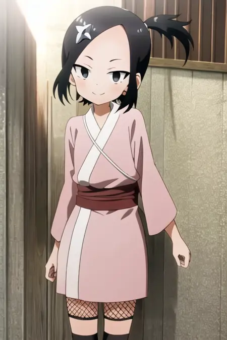 kunoichi_touwata, black eyes, black hair, short hair, pink kimono, side ponytail, hair ormament