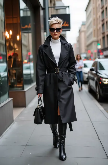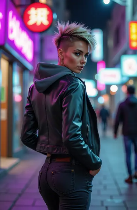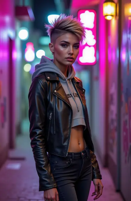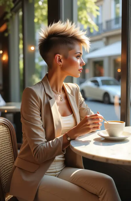 haist005 粗犷、高对比度的 undercut 短发。两侧剃得极短,过渡精准;顶部为铂金色,呈尖刺状分层,向上梳理。