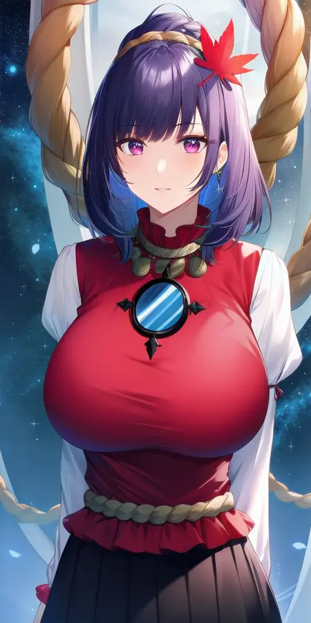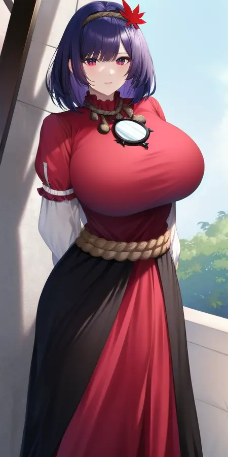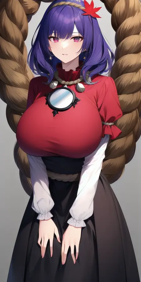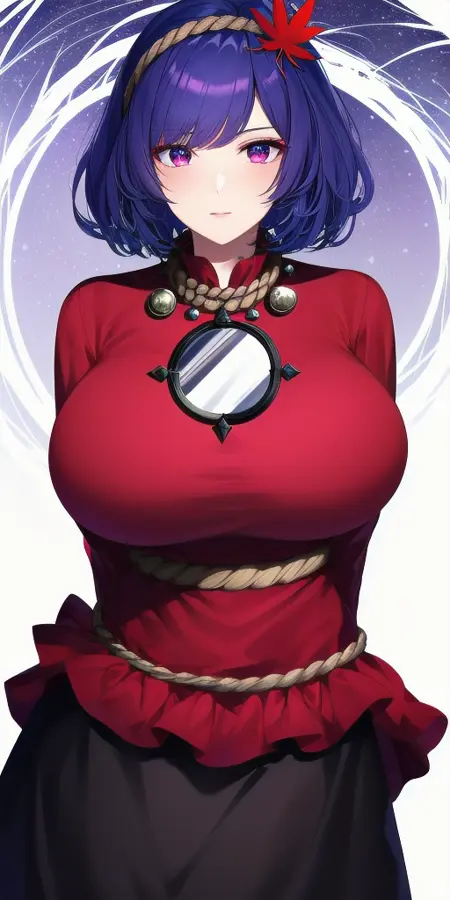 red_shirt_short_over_long_sleeves_white_sleeves_black_skirt_red_trim_rope_belt_frills_rope_necklace_mirror_leaf_hair_ornament: 액세서리까지 포함한 그녀의 고전 복장.