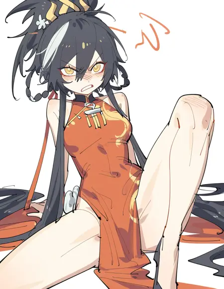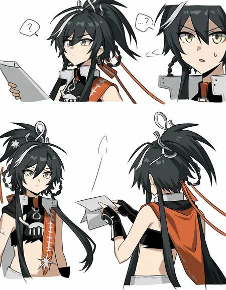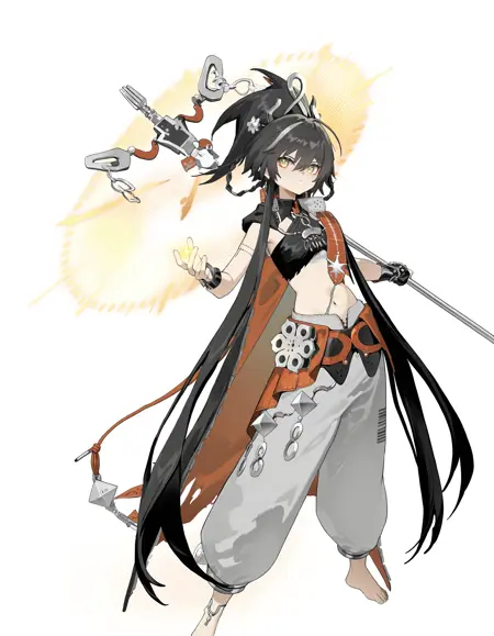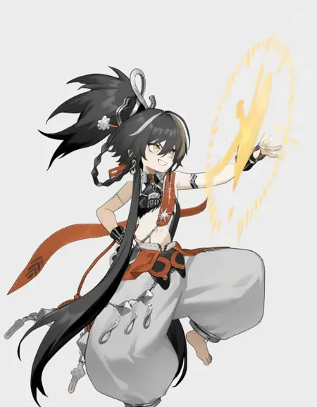 mofei,1girl,solo,black hair,long hair,very long hair,multicolored hair,yellow eyes,braid,hair ornament,jewelry,tattoo,navel,gloves,fingerless gloves,black gloves,cloak,pants,